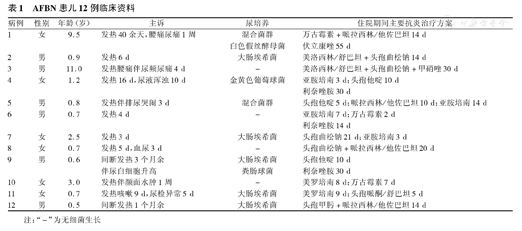 2006年1月至2012年12月深圳市儿童医院收治的AFBN患儿12例。男6例,女6例;年龄6个月~11岁,以婴幼儿为主,其中7例<1岁(58.3%),见表1。