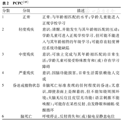 PCPC是评估危重患儿尤其是CPR患儿预后的简易方法,也是评估儿童心脏停搏后神经系统恢复情况的常用标准。PCPC从1(正常)到6(脑死亡)共分为6级,随着分值的增加提示脑功能损害加重,见表2[15]。Fiser等[16,17]于1992年开始使用PCPC评估普通儿科重症监护病房(PICU)的患儿,约58%的患儿从PICU出院时,其PCPC得分正常,且该得分与出院后1个月、6个月的心理测试结果相关性良好。Knoester等[18]也认为,虽然评估PICU存活患儿神经系统认知能力的方法有限,但在出院时及出院后连续进行PCPC分级有利于对PICU存活患儿的神经系统预后进行总体评估,并且结果可靠。