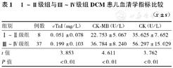 Ⅰ~Ⅱ级组与Ⅲ~Ⅳ级组DCM患儿血清学指标比较(