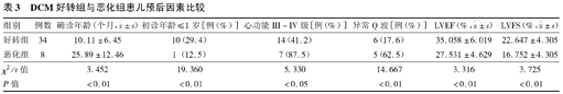 好转组与恶化组在发病确诊年龄、异常Q波发生情况、心功能Ⅲ~Ⅳ级例数、LVEF、LVFS方面差异有统计学意义,见表3。