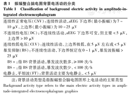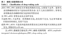 随着aEEG在新生儿应用逐渐增多,特别是早产儿的应用,Hellström-Westas和Rosén[6]于2006年提出了一种aEEG背景活动的新分类方法,以EEG术语为基础,包括睡眠-觉醒周期(SWC)的分类,可用于所有新生儿,见表1。