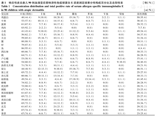 Concentration distribution and total positive rate of serum allergen specific immunoglobulin E in 90 children with atopic dermatitis[n(%)]