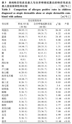 Comparison of allergen positive rates in the 0-3 years old group children diagnosed as atopic dermatitis alone or atopic dermatitis combined with asthma[n(%)]