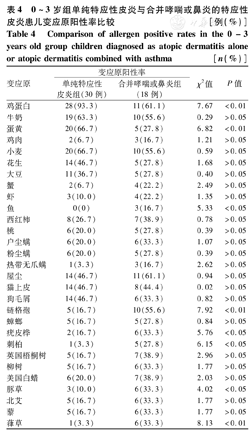根据患儿入组时的临床诊断以及年龄分组,0~3岁组AD患儿共48例,其中30例为单纯AD,另18例为AD合并哮喘或鼻炎组患儿。通过对2组患儿食物及吸入性变应原sIgE阳性率的分析表明二者之间差异有统计学意义(χ2=15.163,P<0.05),单纯AD组患儿中鸡蛋白和蛋黄的阳性检出率高于合并哮喘或鼻炎组,而鱼、链格孢、疣皮桦、刺柏、豚草、葎草的阳性检出率则低于合并哮喘或鼻炎组,其他变应原的阳性检出率在2组患儿间差异无统计学意义,见表4。