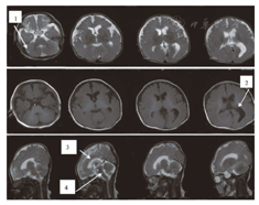注:1:小脑囊肿;2:侧脑室扩大;3:胼胝体发育不良;4:脑干、小脑发育不良 1:cerebellum cyst;2:extensive ventricles;3:corpus callosum dysplasia;4:dysplasia in the brainstem and cerebellum
