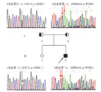 注:Ⅱ2:先证者;Ⅰ1:先证者父;Ⅰ2:先证者母;Ⅱ1:自然流产胎儿;a:先证者父POMT1的第5外显子错义突变c.313C>T,p.R105C;如箭头↓所示;b:先证者母POMT1的第20外显子移码突变c.2208delG,p.W736X,如箭头↓↓所示;c:先证者POMT1的第5外显子错义突变c.313C>T,p.R105C,如箭头↓所示;d:先证者POMT1的第20外显子移码突变c.2208delG,p.W736X,如箭头↓↓所示 Ⅱ2:proband;Ⅰ1:father of proband;Ⅰ2:mother of proband;Ⅱ1:spontaneous abortion fetal;a:father of proband has a missense mutation c.313C>T,p.R105C,just as the arrow showed;b:mother of proband has a frameshift mutation c.2208delG,p.W736X,just as the arrow showed;c:POMT1 gene of proband has a missense mutation c.313C>T,p.R105C,just as the arrow showed;d:POMT1 gene of proband has a frameshift mutation c.2208delG,p.W736X,just as the arrow showed