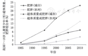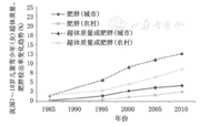25年期间,不同阶段超体质量、肥胖率的增长速度也不尽相同。1985年至1995年、1995年至2000年、2000年至2005年和2005年至2010年肥胖率年均增长值分别为0.10%、0.30%、0.23%、0.23%。1985年至2005年城市肥胖年均增长率高于农村,而2005年至2010年期间,农村年平均增长率高于城市。
