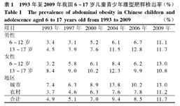 The prevalence of abdominal obesity in Chinese children and adolescence aged 6 to 17 years old from 1993 to 2009(%)
