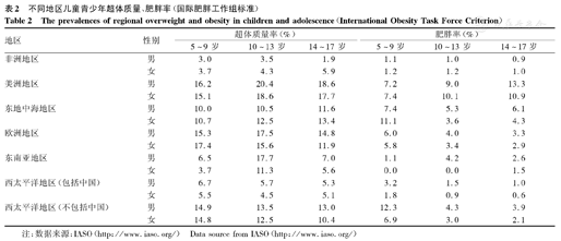 在全世界范围内,儿童青少年肥胖的地区分布极不平衡,不同地区儿童超体质量肥胖率差异很大。据国际肥胖研究学会(International Association for the Study of Obesity,IASO)最新发布的统计结果显示,美洲地区儿童青少年肥胖率最高,其次是欧洲地区、西太平洋地区(不包括中国)和东地中海地区,东南亚地区和非洲地区儿童青少年超体质量、肥胖率较低[35,36],见图8、表2。