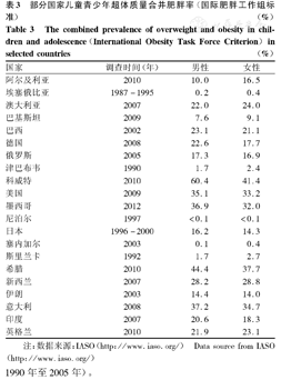 不同国家之间肥胖率差别也很大,部分国家儿童青少年超体质量合并肥胖率(资料来源:IASO)见表3。位于东地中海区域的科威特、阿拉伯联合酋长国,位于美洲地区的墨西哥、美国,位于欧洲地区的希腊、意大利等是全世界儿童青少年超体质量肥胖率最高的国家,这些国家超体质量合并肥胖的检出率均超过30%(调查时间主要集中在2005年至2010年),其中以科威特为最高(男性为60.4%,女性为41.4%)。而位于西亚、非洲地区的尼泊尔、塞内加尔共和国、埃塞俄比亚等国家是超体质量肥胖率最低的国家,检出率均不到1%(调查时间主要集中在1990年至2005年)。