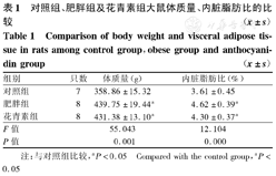 对照组、肥胖组及花青素组大鼠体质量、内脏脂肪比的比较(
