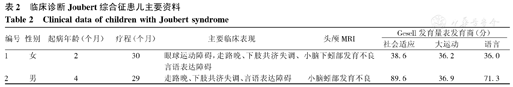15例中临床诊断JS 2例(13%)。男、女各1例,2例均在婴儿早期起病,表现为运动发育落后、下肢共济失调、言语表达障碍;查体双上肢无明显意向性震颤,双下肢肌张力低。例1为女童,起病年龄为出生2个月,首发症状为眼球运动障碍,眼球水平震颤,伴运动、智力发育落后;头颅MRI提示小脑下蚓部发育不良。经30个月临床观察及运动、语言训练、针灸等康复治疗,患儿2岁4个月可独行,步态欠稳、宽基底;2岁6个月开始说话,但进步缓慢,认知反应差,伴言语表达障碍。例2为男童,起病年龄为出生后4个月,首发症状为运动发育落后,双下肢肌张力低;头颅MRI提示小脑蚓部发育不良。经29个月临床观察及康复治疗,患儿3岁5个月可独行,呈宽基底步态,认知反应及语言理解能力可,但存在表达障碍,见表2。