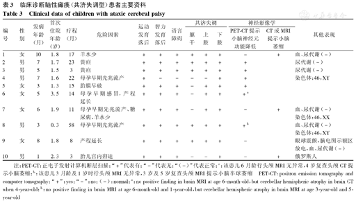 共济失调型脑瘫占所有脑瘫类型的5%~10%[2],属慢性非进行性小脑共济失调范畴,并有报道其占据欧洲世界卫生组织地区儿童共济失调患病率的重要构成部分[14]。据估计大约50%共济失调型脑瘫呈常染色体隐性遗传,McHale等[15]对1个有4例共济失调脑瘫患者的家系利用343个荧光标记多态标志物进行全基因组分析提示致病基因定位在9p12-q12。本组10例共济失调型脑瘫患儿围生期危险因素多样,其与该病的相关性尚未明确,虽部分患者曾行染色体核型分析,血、尿代谢分析未见异常,仍不能排除遗传因素所致。日后对于诊断共济失调型脑瘫患者,有条件者可行DNA芯片检测或多重连接探针扩增技术等基因检测手段以进一步寻找遗传证据;确定相关致病基因可能有助于产前诊断或婚前检查的开展,并可提高对该病的认识。10例中7例头颅MRI或CT提示存在小脑发育不良或小脑萎缩,其中2例在婴儿早期影像学表现不明显,后期复查提示小脑萎缩,患者临床病情相对静止,运动功能缓慢进步,无明显倒退表现;3例患者头颅MRI无明显小脑结构异常,其中2例行头颅PET-CT提示存在小脑神经元代谢功能降低。因此,考虑慢性非进行性小脑共济失调患者多有小脑结构或功能异常,但早期影像学表现可能不明显,临床工作中应注意根据患儿病情定期复查头颅神经影像学检查以明确诊断;且在高度怀疑小脑病变时,即使头颅MRI无阳性发现,可进一步行头颅PET-CT检查以了解小脑神经元代谢功能情况。PET-CT在神经系统疾病的应用日益广泛,大脑皮质中细微的糖代谢、血流等变化可在屏幕上出现不同的图像,凡代谢率高的组织或病变,在PET-CT上呈现明亮的高代谢亮信号,凡代谢率低的组织或病变在PET-CT上呈现出低代谢暗信号[16]。