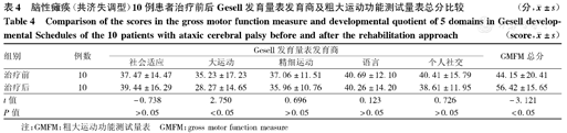 Comparison of the scores in the gross motor function measure and developmental quotient of 5 domains in Gesell developmental Schedules of the 10 patients with ataxic cerebral palsy before and after the rehabilitation approach(score,