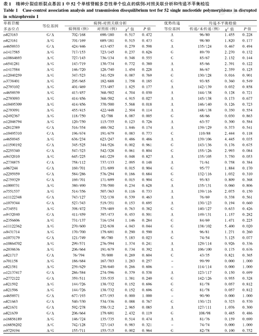 精神分裂症断裂点基因1中52个单核苷酸多态性单个位点的病例-对照关联分析和传递不平衡检验