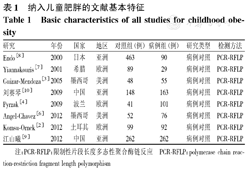 符合标准的8篇[2,3,4,6,7,8,9,10]文献,包含868例肥胖儿童及1 202例健康儿童。中文文献2篇[9,10],余6篇为英文文献[2,3,4,6,7,8]。研究亚洲人群的文献有3篇[8,9,10],欧洲人群的文献3篇[2,4,7],美洲人群文献2篇[3,4,5,6],见表1、表2。