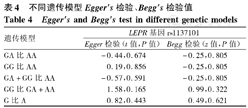 采用metabias命令,对不同遗传模型进行发表偏倚分析,均未发现明显不对称漏斗图,同时Egger's检验、Begg's检验提示未见明显发表偏倚(P均>0.05),即本研究纳入文献无发表偏倚,相关检验值见表4。