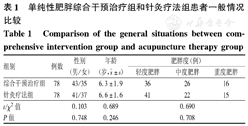 单纯性肥胖综合干预治疗组和针灸疗法组患者一般情况比较