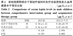 单纯性肥胖综合干预治疗组和针灸疗法组男性患儿血清瘦素水平情况比较(μg/L,