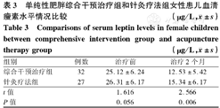 单纯性肥胖综合干预治疗组和针灸疗法组女性患儿血清瘦素水平情况比较(μg/L,