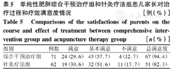 综合干预治疗组患儿家长总满意度(94.4%)高于针灸疗法组(82.3%),差异有统计学意义(χ2=4.849,P=0.028),见表5。