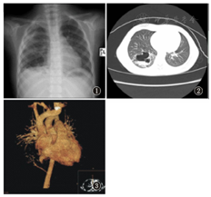 X线表现:右肺纹理模糊毛糙,右肺外带稍致密,右下肺可见多个大小不等囊状透亮影及条、线状及环形致密影(图1);胸部CT平扫:双肺纹理增多、毛糙,右下叶可见大片状影,其内可见大小不等囊状改变,可见气液平面(图2);胸部增强CT扫描+血管重建:腹主动脉上段分出一细小血管绕行后伸入右下肺病变(图3)。