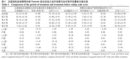 治疗前、治疗第2、4、6、8周为观察点,评估症状,观察不良反应。(1)注意缺陷多动症状疗效评定:以家长填写的ADHD父母评定量表第4版(ADHD-RS-Ⅳ-parent)为主要疗效评价指标。有效为治疗前后总分减分率≥40%。(2)抽动症状疗效评定:以耶鲁综合抽动严重程度量表(Yale Global Tic Severity Scale,YGTSS)分别评估运动性抽动和发声性抽动,且对每类抽动进行5个方面的评价:即抽动的次数、频度、强度、复杂性、干扰,每项分6级做0~5分判分,并独立评估抽动障碍所导致的损害,加入抽动总分中,最后得出量表总分。治疗前后总分减分率>30%为有效[7]。
