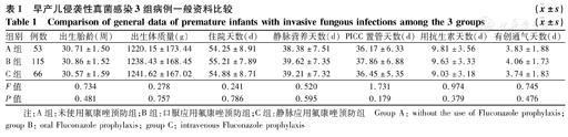 将入选病例按照是否使用以及口服应用还是静脉应用氟康唑预防早产儿IFI分为3组:A组为未使用氟康唑预防组;B组为口服应用氟康唑预防组[6 mg/(kg·次),隔天1次];C组为静脉应用氟康唑预防组[3 mg/(kg·次),每3天1次]。