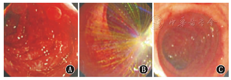 注:A:HSP患儿治疗前十二指肠降部黏膜弥散充血水肿、斑片状出血点及点片状糜烂、溃疡;B:胃镜下凝血酶喷洒治疗;C:该患儿治疗后1周,黏膜充血水肿明显消失,出血点明显消退,但仍可见少许溃疡 A: a child of HSP represented diffuse hyperaemia edema,Patchy bleeders and mess spots of erosion and ulcer in the descending of duodenum mucosa before treatment;B:the imagine from thrombin spraying under gastroscopy;C:1 week after treatment,diffuse hyperaemia edema,Patchy bleeders were disappeared obviously,besides a small ulcers