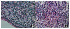 注:A:十二指肠降部黏膜轻至中度慢性活动性浅表炎性反应,镜下黏膜固有层组织内有散在或灶性淋巴细胞浸润,局部见散在粒细胞浸润;B:胃窦黏膜中度慢性浅表性炎性反应,镜下见黏膜层内多量淋巴细胞、浆细胞及少量嗜酸性粒细胞浸润 A:the descending of duodenum mucosa mild to moderate chronic superficial inflammation,activity,the microscopic mucosa lamina propria had scattered or focal lymphocytic infiltration,local found scattered granulocyte infiltration;B:gastric antrum mucosa moderate chronic superficial inflammation,microscopically,the mucous membrane layer of lymphocytes,plasma cells and a small amount of eosinophilic cells infiltration