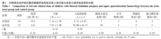 Comparison of relevant clinical data of children with Henoch-Schönlein purpura and upper gastrointestinal hemorrhage between the treatment group and control group