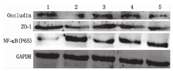 注:ZO-1:Zonula Occludens 1;NF-κB(P65):核转录因子-κB(P65);1:对照组;2:缺氧复氧组;3:缺氧复氧+5.0×10–3 mol/L黄芩苷组;4:缺氧复氧+1.0×10–3 mol/L黄芩苷组;5:缺氧复氧+0.2×10–3 mol/L黄芩苷组 ZO–1:Zonula Occludens 1;NF–κB(P65):nuclear factorκB(P65);1:normal control group;2:hypoxia reoxygenation group;3:hypoxia reoxygena-tion+5×10–3 mol/L Baicalin group;4:hypoxia reoxygenation+1×10–3 mol/L Baicalin group;5:hypoxia reoxygenation+0.2×10–3 mol/L baicalin group