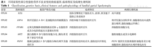 FPLD患者脂肪丢失几乎可发生在生长发育的任何阶段,从幼年到成年均有可能发生。遗传方式也是多样化,可以是常染色体显性遗传、常染色体隐性遗传或伴性遗传。临床表现为四肢、腹部和胸部的对称性脂肪缺失,肌肉组织突显,而下颌、锁骨上、腹腔脂肪堆积,出现类库欣综合征面容。根据致病基因的不同,目前本病共分5种亚型(FPLD1~FPLD5)(表1)[14]。