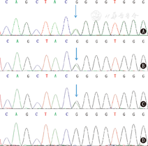 注:A:先证者c.1138G>A;B:先证者母亲c.1138G>A;C:先证者姐姐c.1138G>A;D:先证者父亲正常 A:propositus c.1138G>A;B:propo-situs mother c.1138G>A;C:propositus sister c.1138G>A;D:propositus father,normal