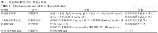 | 人类疱疹病毒6型、巨细胞病毒 | 更昔洛韦和膦甲酸钠 | 诱导治疗:更昔洛韦(5 mg/kg,2次/d)+膦甲酸钠(60 mg/kg,q8 h或90 mg/kg,q12 h) | 免疫功能正常者21 d |