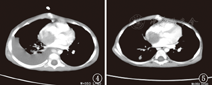 本研究中伴下腔静脉瘤栓10例,占19.23%(10/52例),其中2例经下降静脉血行播散至右心房形成巨大转移瘤。2例均为男童,初诊年龄分别为3岁1个月和3岁10个月(图4、图5)。3岁1个月患儿肺转移出现于介入治疗及右心房瘤栓切除术后,经术后化疗后达到部分缓解11个月,后因心脏转移瘤、肺转移、肝内多发转移复发后经化疗7个周期病情进展死亡,OS为2年11个月。3岁10个月患儿,病初经术前全身化疗4个周期、手术治疗、术后化疗9个周期达到完全缓解,截止随访日期无病生存21个月。