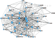 通过Excel展开矩阵分析,对高频关键词存在的共篇关系展示,之后借助于Netdraw程序、网络分析集成软件Ucinet 6.0分析二维数据,并将结果可视化[6]。获取的共现分析图主要特点如下:(1)在整个网路中,图中心位置的关键词占据了核心位置;(2)词频高相应的结点也就越大;(3)各关键词之间的距离越短,且相互之间的连线越粗,则说明他们之间关系越密切。