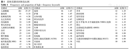 | 婴儿痉挛症 | 32 | 3.34 | 癫痫持续状态 | 15 | 1.57 | 预后 | 11 | 1.15 |
