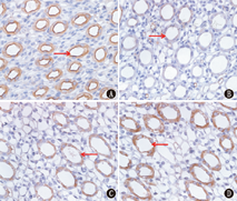 普通光镜下放大400倍观察,AQP2阳性细胞呈棕黄色,主要集中在内髓集合管,位于主细胞顶端膜和胞质中。经Image-Pro Plus图像分析软件统计分析,Sham组阳性表达的平均吸光度值最大,BUO-R+EPO组次之,BUO组最小。组织学上可见BUO组、BUO-R组和BUO-R+EPO组集合管管壁变薄、管腔增大,明显不同于Sham组,见图1,表3。