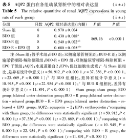 曝光胶片经凝胶灰度值分析软件分析,4组之间AQP2蛋白条带相对于内参条带的灰度值比较差异有统计学意义。Sham组表达量最高,BUO-R+EPO组次之,BUO-R组再次,而BUO组表达量最低(P<0.05),见图2、表5。