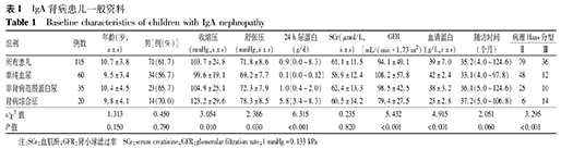 IgA肾病是临床常见的原发性肾脏疾病,国内成人原发性IgA肾病占所有肾脏病比例的40%~50%[1,2]。研究认为15%~40%的IgA肾病患者20年后可能发展为终末期肾病[3,4]。蛋白尿和高血压是决定成人IgA肾病进展的独立危险因素[5]。但是,关于影响儿童IgA肾病预后的相关因素研究不多。关于IgA肾病的治疗,成人IgA肾病在尿蛋白定量超过1 g/d时加用糖皮质激素,激素治疗无效时,推荐使用霉酚酸酯(MMF)或环磷酰胺(CTX)。但是,儿童IgA肾病患儿不同程度蛋白尿的治疗尚无统一标准[6,7]。本研究回顾性分析了115例原发性IgA肾病患儿的治疗和随访,旨在探讨儿童IgA肾病的最佳治疗方案,为规范化治疗提供临床依据。