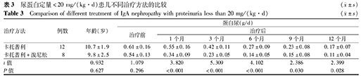 在治疗后1个月,3个月,6个月,9个月,12个月后,卡托普利加用泼尼松口服治疗患儿的尿蛋白定量明显低于单用卡托普利治疗的患儿。具体数值见表3。