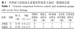 对照组与试验组儿童重度肝损害儿童的一般情况比较