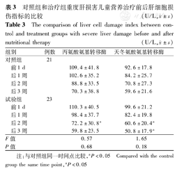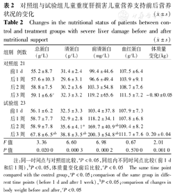 对照组与试验组儿童重度肝损害儿童营养支持前后营养状况的变化 (