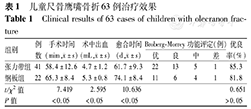 选择2006年1月至2014年1月重庆医科大学附属儿童医院诊断为尺骨鹰嘴骨折采用手术复位内固定治疗的63例患儿。其中男45例,女18例;年龄2~16岁,平均年龄8岁。受伤机制:跌倒伤35例、高处坠落伤15例、交通事故13例;左侧22例,右侧41例。所有骨折分类按照Schatzker分型:A横行骨折17例,B横行-压缩性骨折9例,C斜形骨折24例,D粉碎性骨折13例;按Mayo分型[3]:Ⅱ型38例,Ⅲ型25例。骨折入院后均在3 d内签署知情同意书并完成手术,根据手术方式分组为张力带组和钢板组。本研究经医院医学伦理委员会批准。