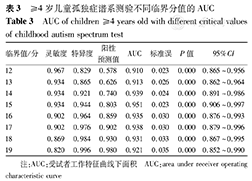 AUC of children ≥4 years old with different critical values of childhood autism spectrum test