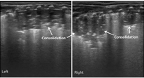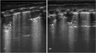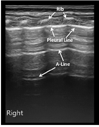 新生儿正常肺组织在超声下呈低回声,胸膜线与A-线均清晰显示,呈光滑、清晰、规则的高回声,二者与等间距平行排列;实时超声下肺滑清晰存在,无或可有少数几条B线;但无胸腔积液、肺实变(图1)。