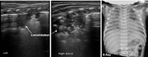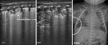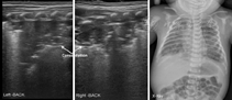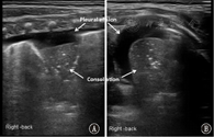 本组MAS患儿的肺脏超声主要表现(表1):(1)肺实变伴支气管充气征:见于所有患儿,重度患儿通常为范围较大、且边界不规则(锯齿状边缘)的实变区(图2,图3,图4);而轻度患儿则以小范围的局限性实变为主要表现(图5);但双侧肺脏实变范围的大小可以不同,而且同一侧肺脏野可以存在大小不同的实变区(图4,图5,图6)。(2)胸膜线异常与A-线消失,见于所有患儿,胸膜线异常表现为病变区胸膜线消失或增粗模糊(图2,图3,图4,图5,图6)。(3)肺不张,是严重肺实变的表现,见于重度患儿,本组12例(17.9%)(图7),严重大面积肺不张时可在实时超声下见到肺搏动和动态支气管充气征。(4)胸腔积液,见于9例(13.4%)患儿(图7)。(5)B-线或AIS,在实变区以外肺野则以AIS或B-线为主要表现。