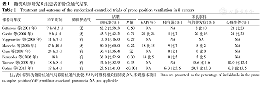 注:表中资料为俯卧位通气与仰卧位通气比较;VAP:呼吸机相关性肺炎;NA:未观察本项目 Data are presented as the percentage of individuals in the prone vs.supine position;VAP:ventilator associated pneumonia;NA:not applicable