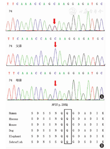 A:P4 NFIX c.613C>T hete-rozygous mutation,and his parentsNFIX c.613C were wild type(arrow);B:NFIX p.Q205 was conserved across different species (data from UCSC Genome Browser database)